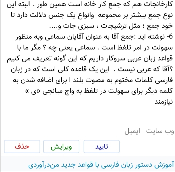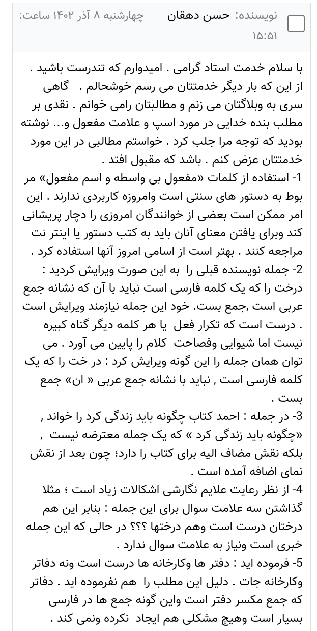 در تصویر بعدی مطلبی در مورد فارسی نبودن جمع "دفتر" بهجمع مکسر "دفاتر" و همینطور فارسی نبودن جمع "کارخانه" به "کارخانجات" و دیگر موارد مشابه، باید عرض کنم، نمونههای ذکرشده، میبایست با یکی از نشانههای جمع فارسی جمع بسته شوند. یعنی در زبان فارسی "دفترها" و "کارخانهها" درست است، نه "دفاتر" و "کارخانجات" هر چند که در متون پیشینیان دارای پیشینهای چشمگیرند.