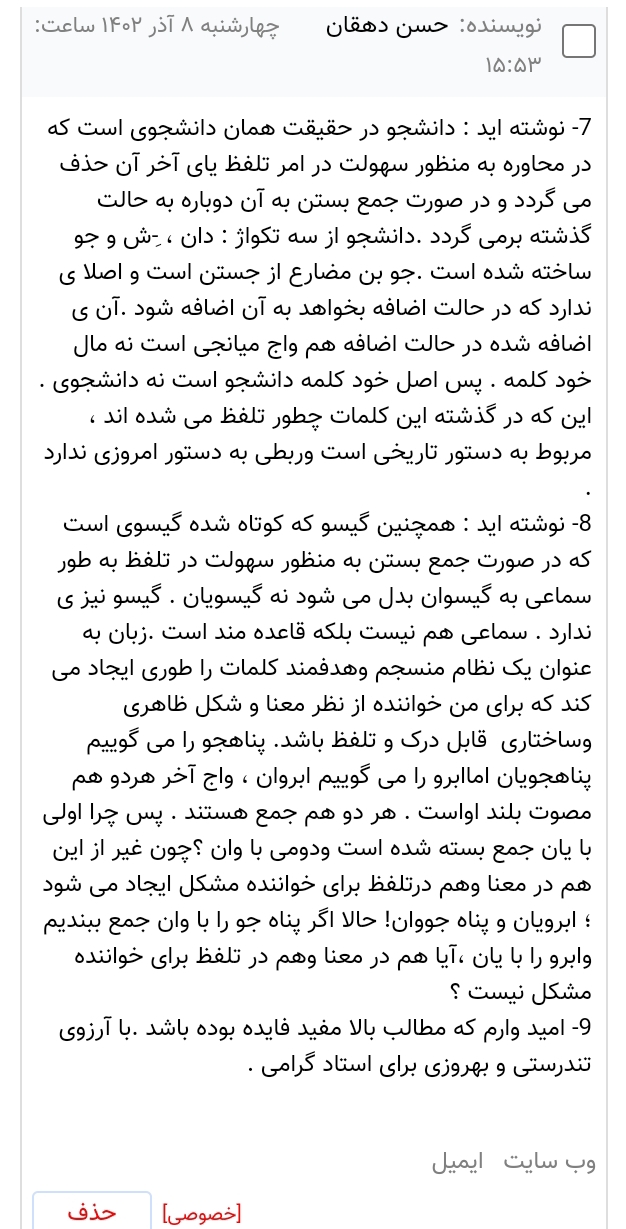 چنانچه ادیبی مطالب تصویری فوق را بخواند، بیدرنگ متوجه اشتباههای فاحش مدرس محترم میشود. حال ایشان از درج مطالب ذکرشده، چه منظوری دارند و چه انگیزهای موجب شده تا اینگونه سخن بر زبان برانند، خدا میداند.