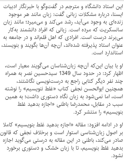 از ایشان میپرسم: آیا چنین شخصی را سراغ دارند؟ چون افرادی را که معرفی کردهاند، هیچکدام دارای زبان معیار نیستند و به گفتهی خودشان فقط نگاه زبانشناسانه دارند و در آنان اعتقادی به قواعد دستوری مشاهده نمیشود!